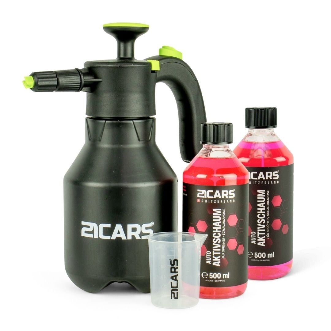 - 21CARS® Schaumkanone: Eine speziell entwickelte Sprühflasche für Aktivschaum, die für eine optimale Schaumverteilung sorgt. Die Kanone ist einfach zu bedienen und kommt mit einem standardmontierten, für Autos optimierten Schaumaufsatz.